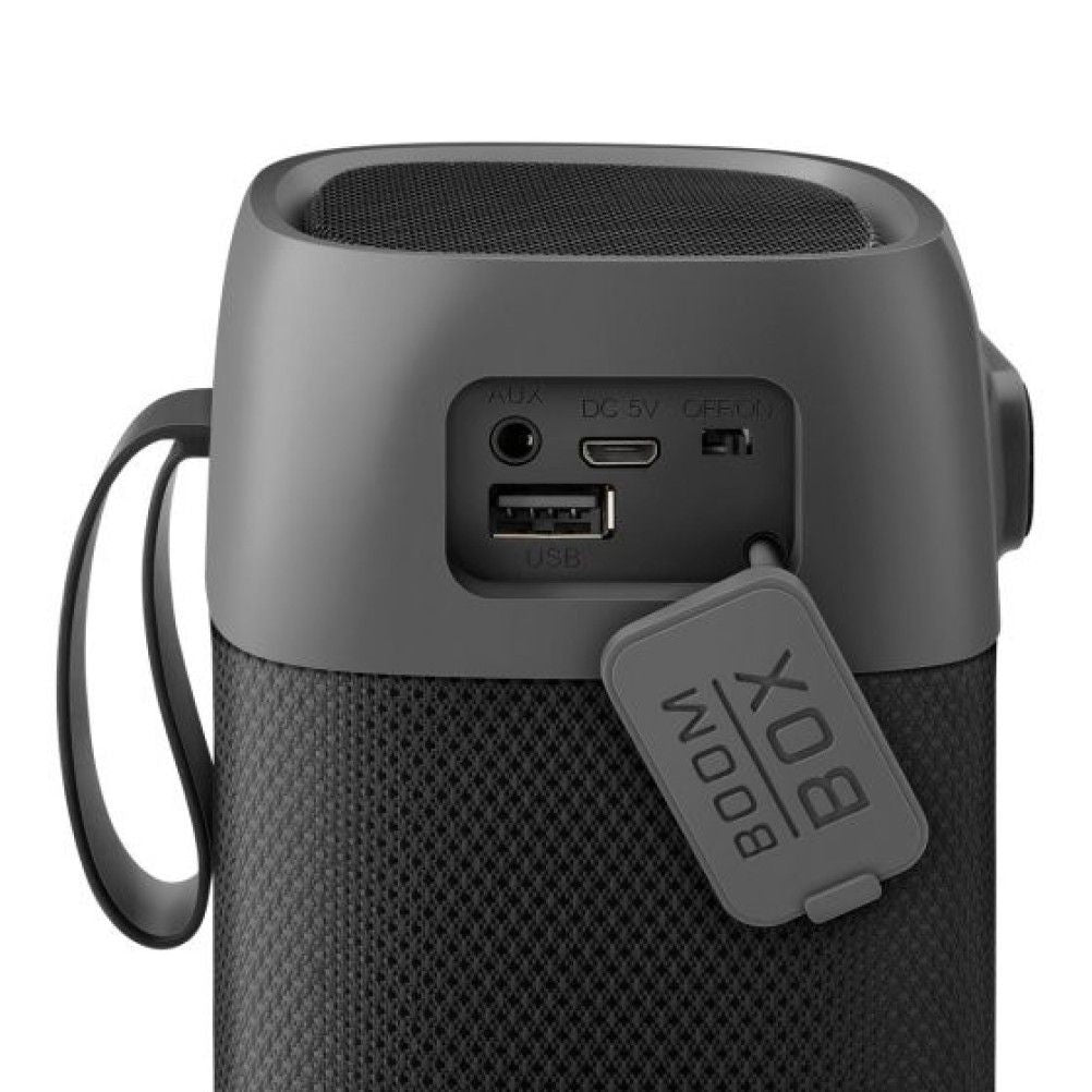 Su diseño es estilo BoomBox cuadrado con acabado textil suave al tacto y tiene rejilla metálica en los extremos.