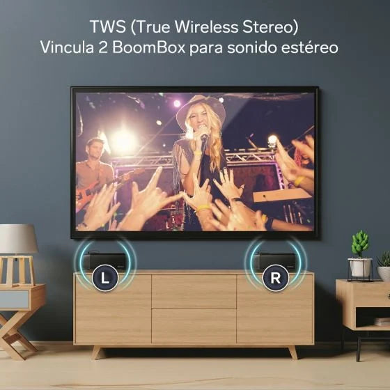 Tiene Bluetooth* 5.0 que, además de vincular tu celular, permite conectar 2 bocinas entre sí y reproducir la misma pista en ambas, a través de AudioLink TWS (True Wireless Stereo).
