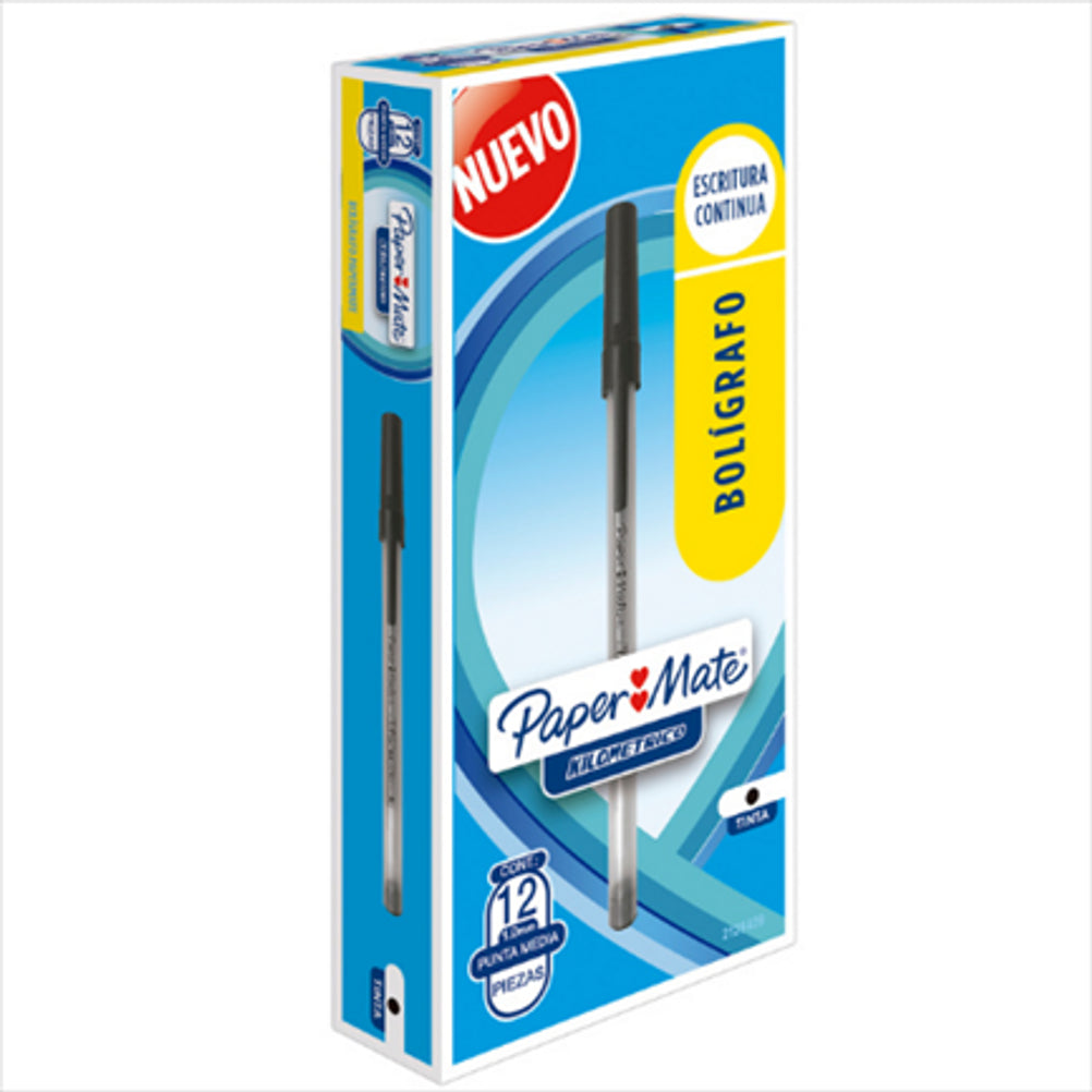 El Bolígrafo Papermate Kilométrico Económico tiene una punta mediana de 1.0 mm con tinta de color negro, ofrece una escritura suave y duradera. Este paquete incluye 12 piezas, lo que lo convierte en una opción económica y práctica para el uso diario en oficinas o escuelas.