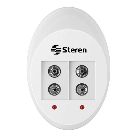 Está fabricado en plástico blanco y cuenta con clavija abatible en la parte trasera para que guardarlo sea más sencillo. Tiene 2 espacios para conectar de forma independiente o simultanea una o dos baterías. Incluye 2 pilas de 9 Volts.