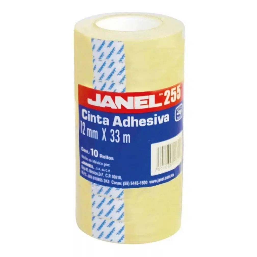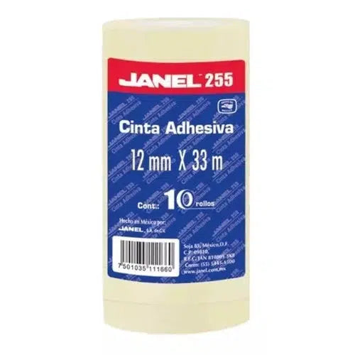Cinta Adhesiva Janel Modelo 255 de 12 mm x 33 metros. Contenido 10 rollos, listos para usarse. Ideal para todo tipo de labores del hogar, escolares y de oficina.