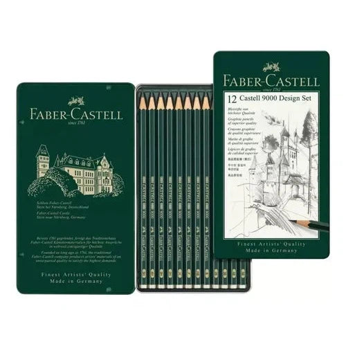 Los lápices de grafito de Faber-Castell 9000 son genuinamente clásicos, fueron lanzados por el conde Alexander von Faber-Castell en 1905. Su calidad y sus grados de dureza finamente graduados los han convertido en un favorito entre los artistas e ilustradores. Su plomo está totalmente adherido con el marco de madera y, por lo tanto, es particularmente resistente a la rotura. Afilado fácil, cubierto de varniz base agua. Esta caja metálica contiene 6 lápices de grafito de calidad superior. Contiene los grados de dureza: 5B, 4B, 3B, 2B, B, HB, F, H, 2H, 3H, 4H, 5H. Son ideales para escribir, dibujar y hacer esbozos.