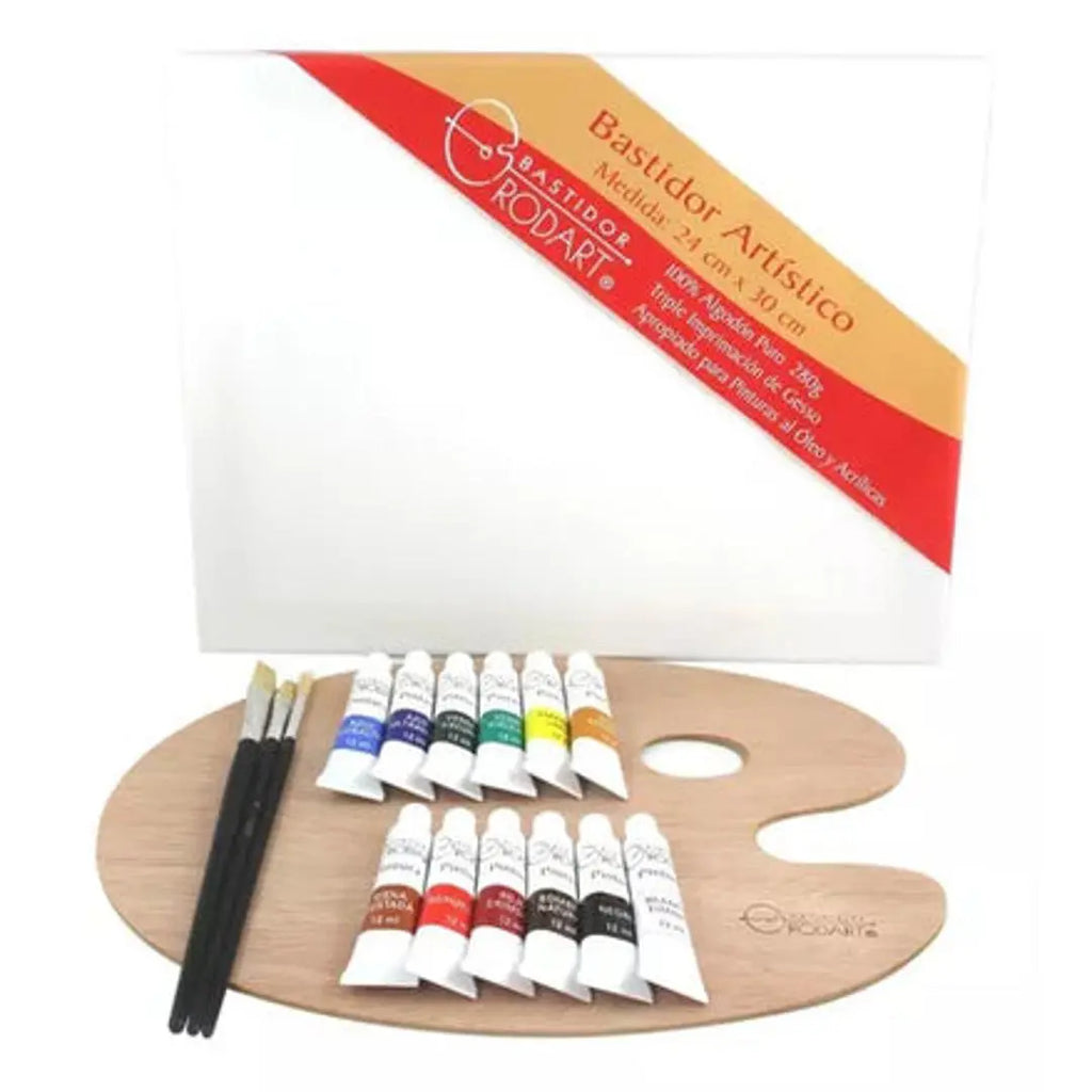 Incluye: 12 Tubos de Pintura tipo Óleo Rodart de 12 ml c/u, 3 pinceles de Cerda, 1 paleta de Madera (24 x 30 cms) y 1 Bastidor con tela preparada (24 x 30 cms)