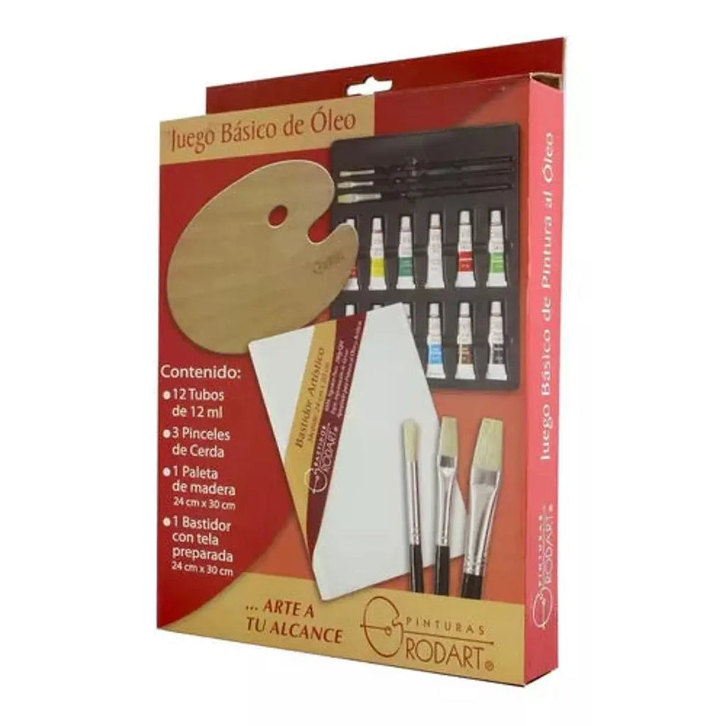 Juego con los materiales básicos para pintar al óleo: Pinceles y paleta para mezclar y aplicar las pinturas, bastidor entelado y 12 colores al Óleo Rodart en 12 tubos de 12 ml, no tóxicas, que están elaboradas con ingredientes de calidad y un alto nivel de pigmentación, excelente poder cubriente, de consistencia uniforme que al secar crean una película flexible.