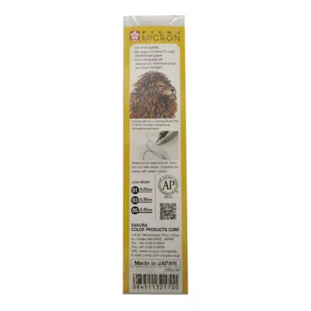 Los estilógrafos Sakura Pigma Micron son ampliamente utilizados por artistas e ilustradores para realizar dibujos detallados y precisos. No contienen ácido, lo que los hace ideales para cualquier aplicación que requiera precisión y permanencia. La tinta Pigma no se difumina ni se destiñe, incluso al ser utilizada en el papel más delgado. La tinta Pigma deriva de un solo pigmento para garantizar la consistencia del color y es resistente a la decoloración producida por la luz solar o UV.