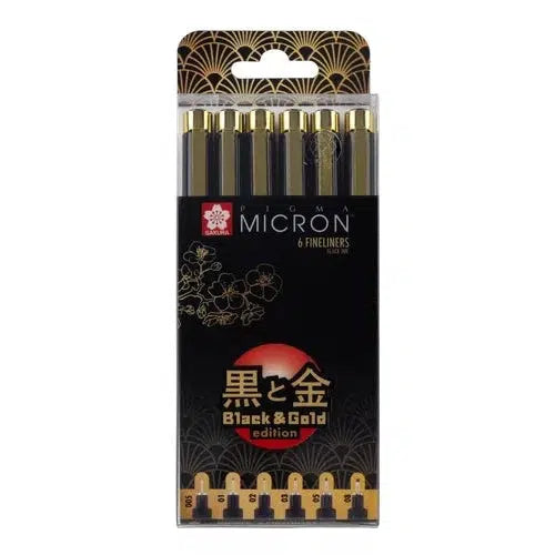 Kit con 6 estilógrafos Sakura Pigma Micrón Edición Limitada Negro y Oro (Black & Gold Edition) que incluye: 005, 01, 02, 03, 05 y 08.