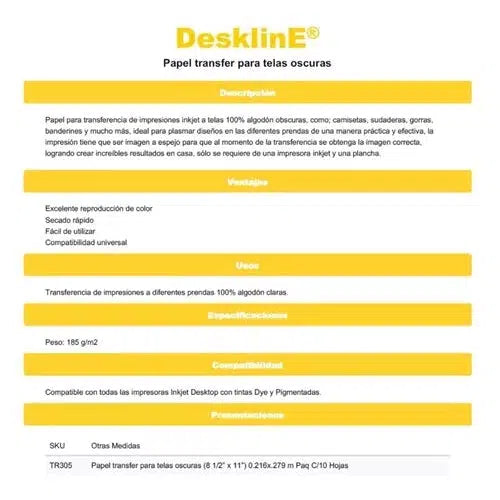Papel para transferencia de impresiones inkjet a telas 100% algodón obscuras, como; camisetas, sudaderas, gorras, banderines y mucho más, ideal para plasmar diseños en las diferentes prendas de una manera práctica y efectiva, la impresión tiene que ser imagen a espejo para que al momento de la transferencia se obtenga la imagen correcta, logrando crear increíbles resultados en casa, sólo se requiere de una impresora inkjet y una plancha.