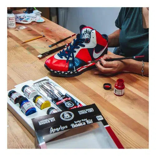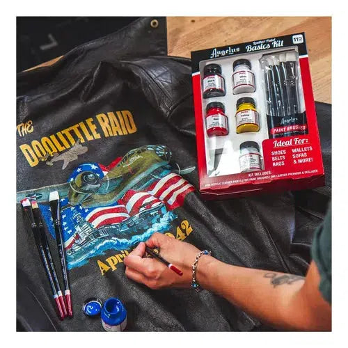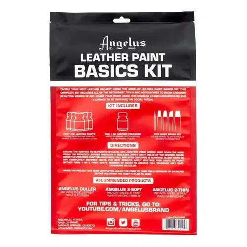 Las Pinturas Acrílicas Angelus Leather Paint Basics Kit son ideales para todo tipo de cuero Zapatos, Bolsas, Cinturones, Carteras, Muebles. Contiene 5 pinturas, 5 pinceles para el toque perfecto de cepillos para elegir, con un preparador de cuerpo necesario para reparar cuero liso para el proceso de pintura.