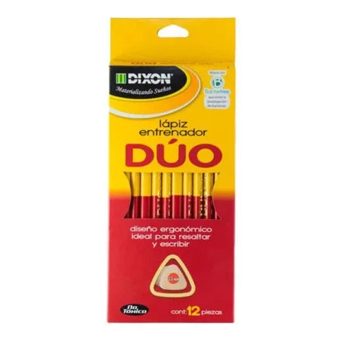Escribe, resalta, dibuja o colorea con El Lápiz Entrenador Dúo de la marca Dixon. Es de forma triangular y está diseñado para escribir y resaltar cómodamente los textos o apuntes. Cuenta con punta de grafito en un lado y de color rojo en otro, por lo que es ideal para preescolar y primaria. Además, son los únicos con Bacterfree, un recubrimiento especial que evita la propagación de bacterias.