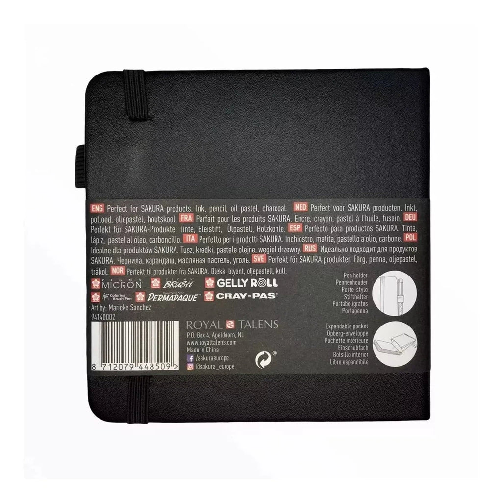 La libreta Sketch Note Book Sakura esta diseñada para llevarla a todas partes por su pequeño tamaño, ya que es perfecta para tinta, lápiz, pastel al óleo y carboncillo. Libre de ácido y resistente al envejecimiento. Ideal para dibujar y escribir. La banda elástica asegura que el libro permanezca cerrado y compacto durante los viajes. La funda exclusivamente ilustrada se puede utilizar como marcador de libros. Con un porta lápices que se adapta perfectamente a bolígrafos como pigma micron y sakura gelly roll. En la parte posterior se incluye un sobre expansible para almacenar bocetos y notas. Apto para todas las edades y todos los artistas, tanto experimentados como principiantes.