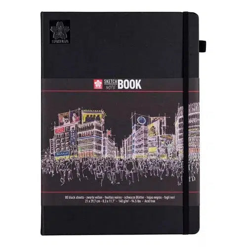 La libreta Sketch Note Book Sakura esta diseñada para llevarla a todas partes por su pequeño tamaño, ya que es perfecta para tinta, lápiz, pastel al óleo y carboncillo. Libre de ácido y resistente al envejecimiento. Ideal para dibujar y escribir. La banda elástica asegura que el libro permanezca cerrado y compacto durante los viajes. La funda exclusivamente ilustrada se puede utilizar como marcador de libros. Con un porta lápices que se adapta perfectamente a bolígrafos como pigma micron y sakura gelly roll. En la parte posterior se incluye un sobre expansible para almacenar bocetos y notas. Apto para todas las edades y todos los artistas, tanto experimentados como principiantes.