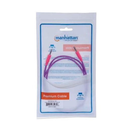 El cable Manhattan 3.5mm Macho Recubrimiento Textil, con una longitud de 1 metro y un peso de 25 gramos, es un accesorio diseñado para transmitir señales de audio desde dispositivos móviles a otros equipos compatibles. Su conector macho en ambos extremos permite conectarlo fácilmente a los puertos correspondientes sin necesidad de adaptadores adicionales.Este modelo cuenta con un recubrimiento textil que le brinda mayor resistencia al desgaste y protección contra posibles daños por torsión o dobleces excesivos. Además, su chaqueta está fabricada en cloruro de polivinilo (PVC), lo que garantiza una alta durabilidad ante el uso diario.En cuanto a sus características técnicas, el AWG calibre del cable es de 28, lo que asegura la transmisión eficiente y nítida del sonido sin interferencias ni pérdidas significativas. El factor de forma del conector en ambos extremos es derecho, facilitando así su conexión directa sin complicaciones.Disponible en tonalidades rosa y púrpura combinadas armoniosamente entre sí, este producto se presenta en una bolsa plástica individual para su almacenamiento seguro hasta su utilización posterior. Cabe destacar que cada paquete contiene únicamente una pieza del cable Manhattan 3.5mm Macho Recubrimiento Textil. Admite
