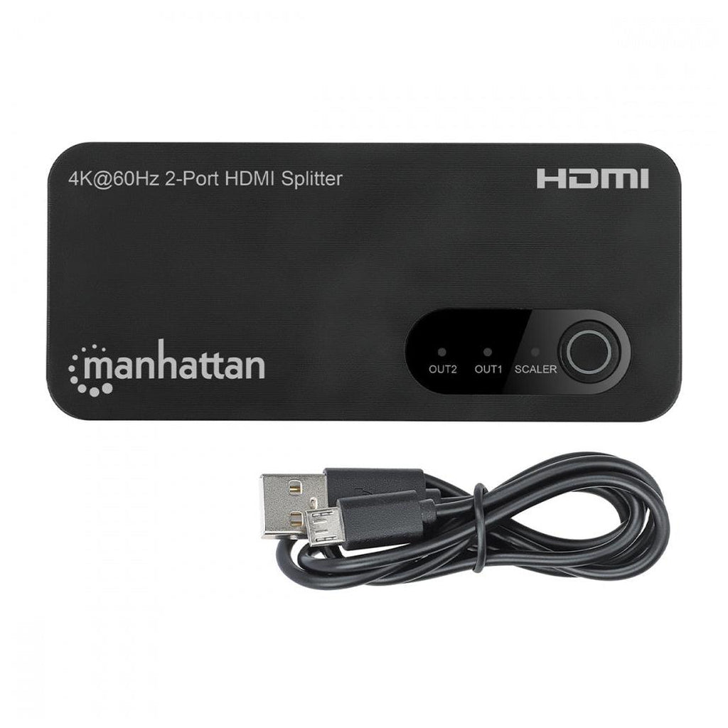 El Manhattan Video Splitter HDMI es un dispositivo que permite la conexión de hasta dos dispositivos con puertos HDMI a una sola pantalla o proyector. Este producto cuenta con una versión HDMI 2.0 y tiene una velocidad de transferencia de datos de 18 Gbit/s, lo cual garantiza una excelente calidad en la transmisión del contenido.Este splitter está diseñado para trabajar en un intervalo de humedad relativa entre el 5% y el 90%, por lo que puede ser utilizado en diferentes ambientes sin preocupaciones. Además, su ancho de banda es de 600 MHz y su consumo máximo es de solo 5 W, lo cual hace que sea eficiente energéticamente hablando.En cuanto a las características técnicas del Manhattan Video Splitter HDMI, este soporta resolución HD tipo Ultra HD (4K) y tiene una altura total de tan solo 15 mm. El paquete incluye cables USB Tipo-A a Micro-USB Tipo-B para facilitar la instalación del equipo.Por otro lado, este dispositivo cuenta con HDCP versión 2.3 y posee dos puertos HDMI como salida principal al conectarlo a otros equipos compatibles; además, su máxima velocidad actualización alcanza los 60 Hz.La carcasa externa del Manhattan Video Splitter HDMI está fabricada en plástico resistente color negro e incorpora indicadores LED para mostrar el estado operativo del equipo durante su uso normal. Asimismo, cumple con certificaciones internacionales tales como CE FCC RoHS REACH UKCA asegurando así sus altos niveles seguridad eléctrica.En conclusión podemos decir que si buscas un dispositivo confiable capaz transmitir señales audiovisuales desde varios dispositivos hacia uno sólo sin perder calidad ni estabilidad entonces el Manhattan Video Splitter HDMI podría ser justo lo que necesitas. Proyecta video desde una fuente HDMI en dos pantallas HD Brinda una señal nitida y clara desde un reproductor Blu-Ray, decodificar, receptor satelital Se puede conectar en cascada hasta tres niveles para expandir la distribución de la señal a más pantallas Compatible con HDCP Soporta sonido LPCM, DTS@, Sonido Master DTS-HD y Dolby TrueHD Soporta una resolución 1080p, así como video HD 3D y color intenso Soporta ancho de banda de amplificador de video de hasta 2.25 Gbps Plug and Play: no requere configuración especial, alimentación o control Contactos en chapa de oro para conexiones libres de corrosión