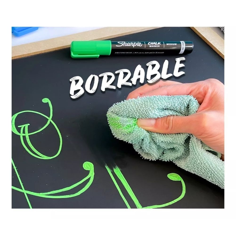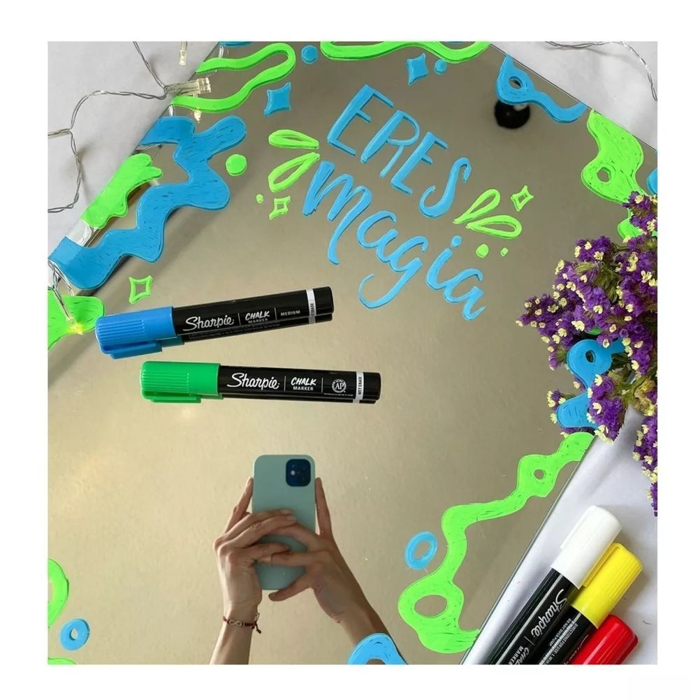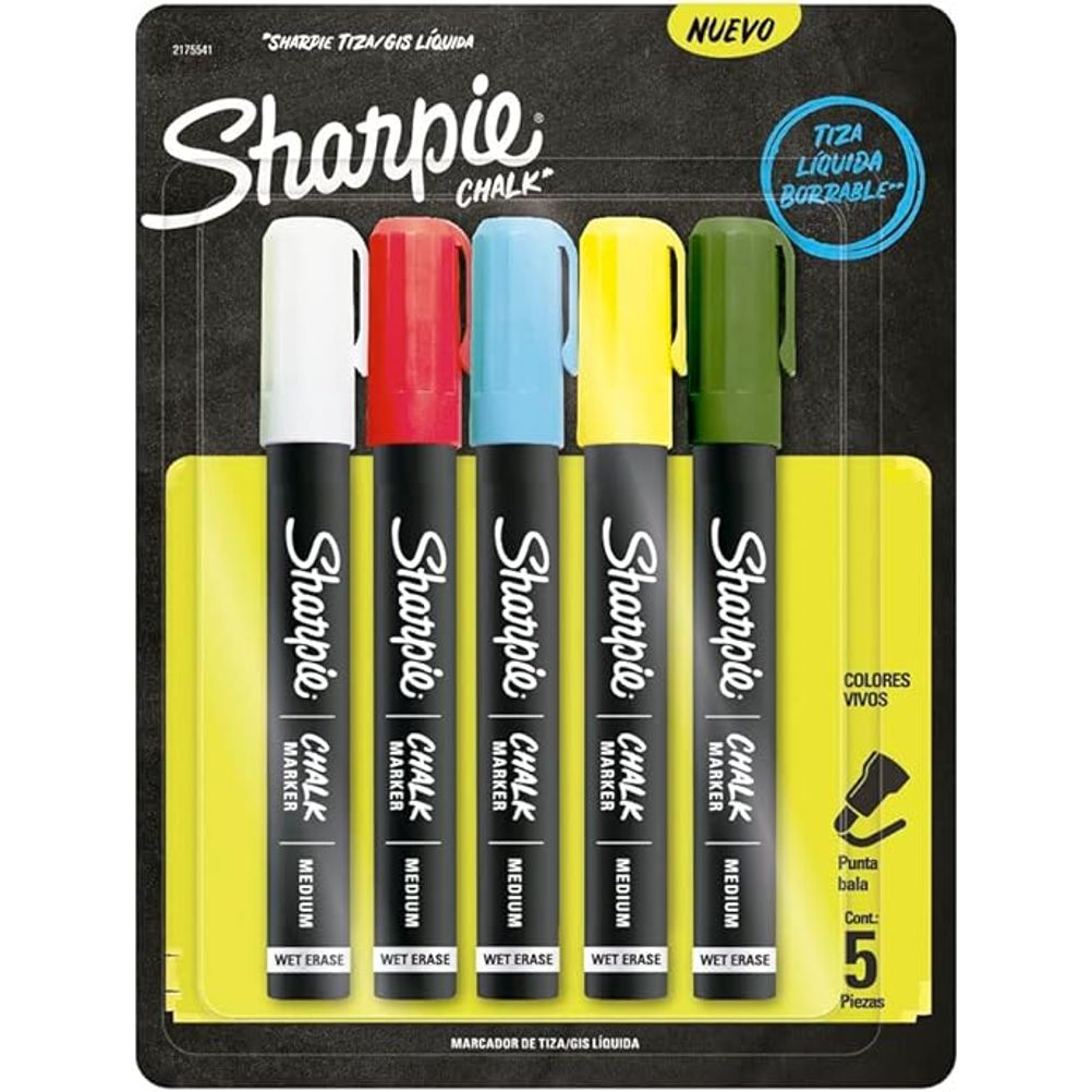 El Sharpie Marcador para Vidrio Chalk es un paquete de 5 marcadores diseñados para escribir y dibujar en superficies de vidrio como ventanas y espejos. La tinta es a base de agua, no permanente, y se puede borrar fácilmente. Los colores incluidos son blanco, rosa, azul claro, verde lima y amarillo. Estos marcadores son ideales para proyectos creativos y decorativos, y también se pueden usar en superficies lisas como plástico e incluso algunos clientes lo han utilizado en el pizarron para Gis sin dejar residuos permanentes.