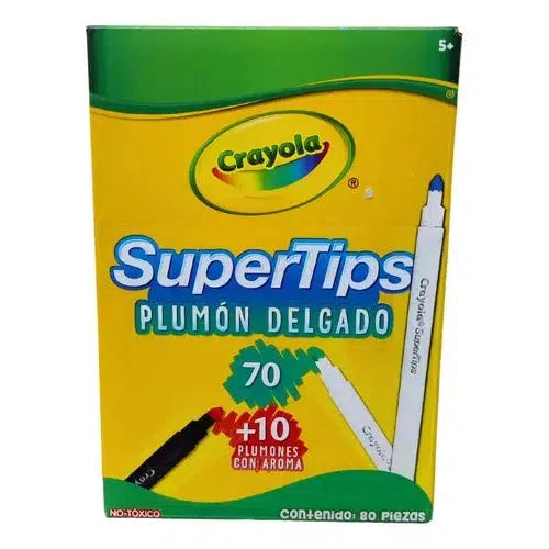 Los Super Tips de Crayola tienen una gran variedad de colores en 80 plumones lavables, su punta versátil te permite dibujar líneas gruesas o delgadas. Su tinta está especialmente diseñada para que pueda lavarse fácilmente de la piel y en diversas telas.