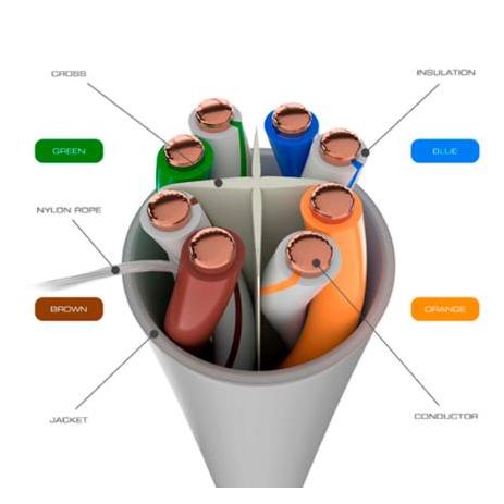 Características del conductor: | Tipo de cable: Par trenzado sin blindar (UTP) | Número de pares: 4 | Número de conductores: 8 | Material conductor: Cobre sólido pulido | Calibre del conductor: 23 AWG |
