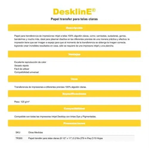 Papel para transferencia de impresiones inkjet a telas 100% algodón claras, como; camisetas, sudaderas, gorras, banderines y mucho más, ideal para plasmar diseños en las diferentes prendas de una manera práctica y efectiva, la impresión tiene que ser imagen a espejo para que al momento de la transferencia se obtenga la imagen correcta, logrando crear increíbles resultados en casa, sólo se requiere de una impresora inkjet y una plancha.