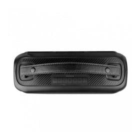 El diseño de la bocina es práctico y portátil, con un asa de transporte que facilita su movilidad. Su iluminación LED multicolor añade un toque visual atractivo, mientras que su radio FM permite disfrutar de estaciones de radio. La bocina tiene un tamaño de 360 mm de ancho, 155 mm de altura y 135 mm de profundidad, con un peso de 1.96 kg, lo que la hace fácil de transportar.