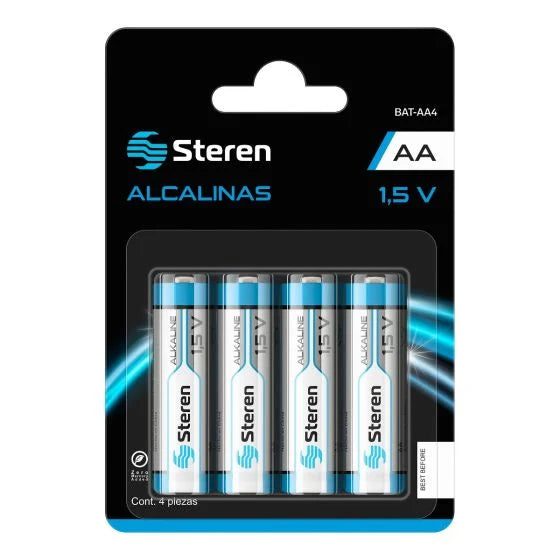 Pila o batería alcalina tamaño AA, de 1,5 Volts, diámetro de 1,4 cm, para uso general. Su presentación es en paquete de 4 pilas.