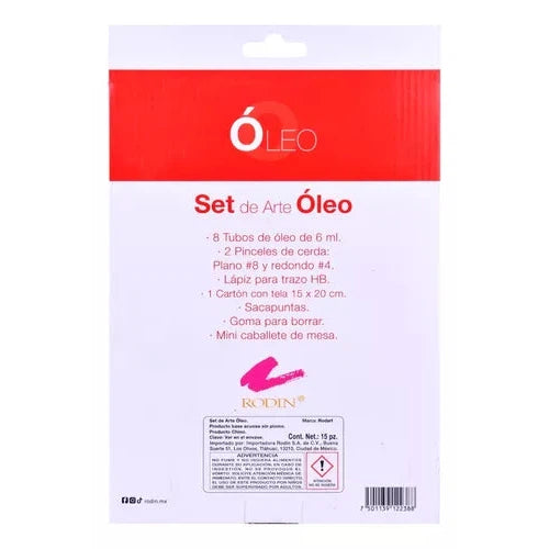Juego con los materiales básicos para pintar al óleo: Caballete, Pinceles, carton adecuados con tela preparada y 8 colores al Óleo Rodart en 8 tubos de 6 ml, no tóxicas, que están elaboradas con ingredientes de calidad y un alto nivel de pigmentación, excelente poder cubriente, de consistencia uniforme que al secar crean una película flexible.